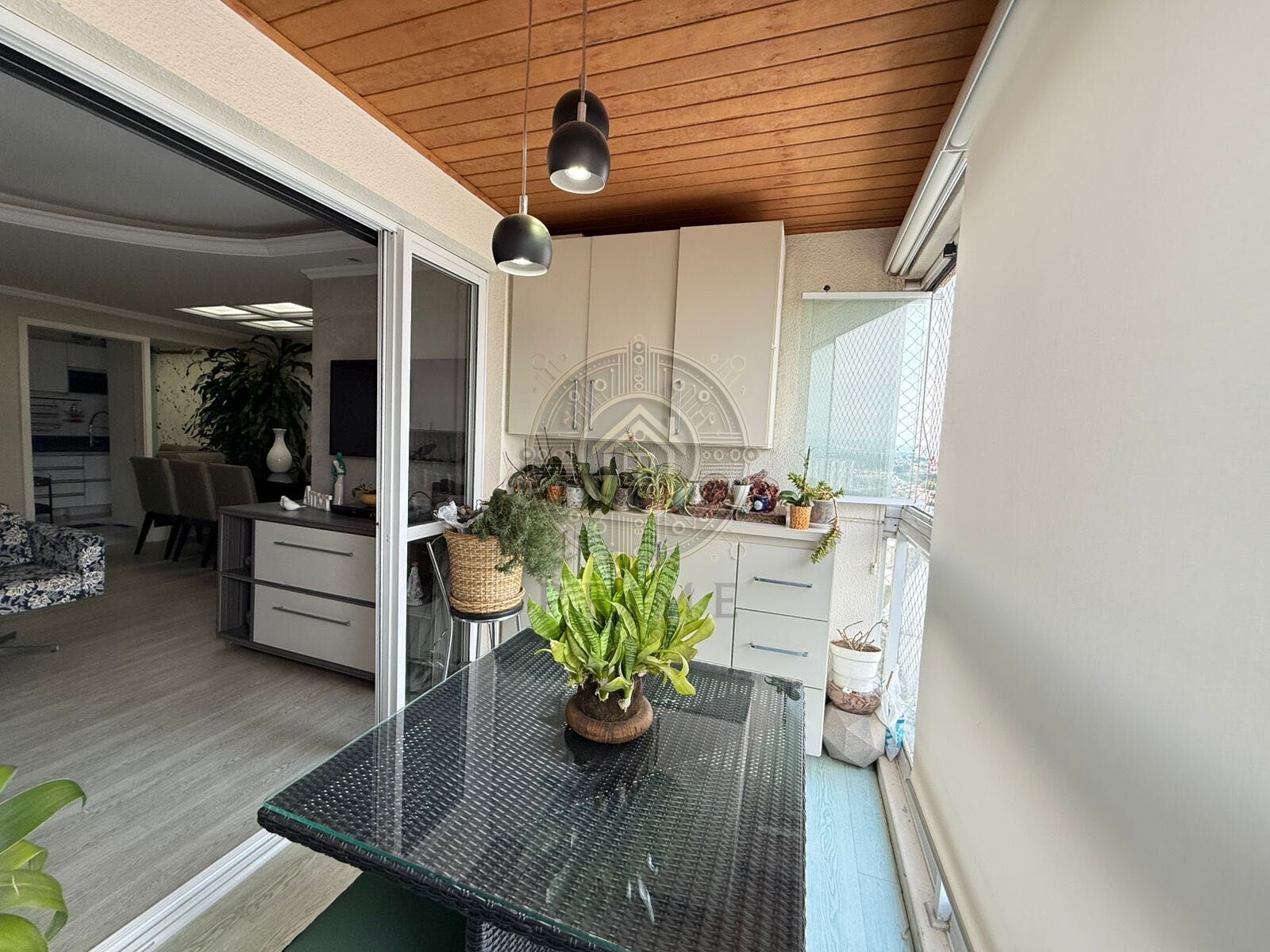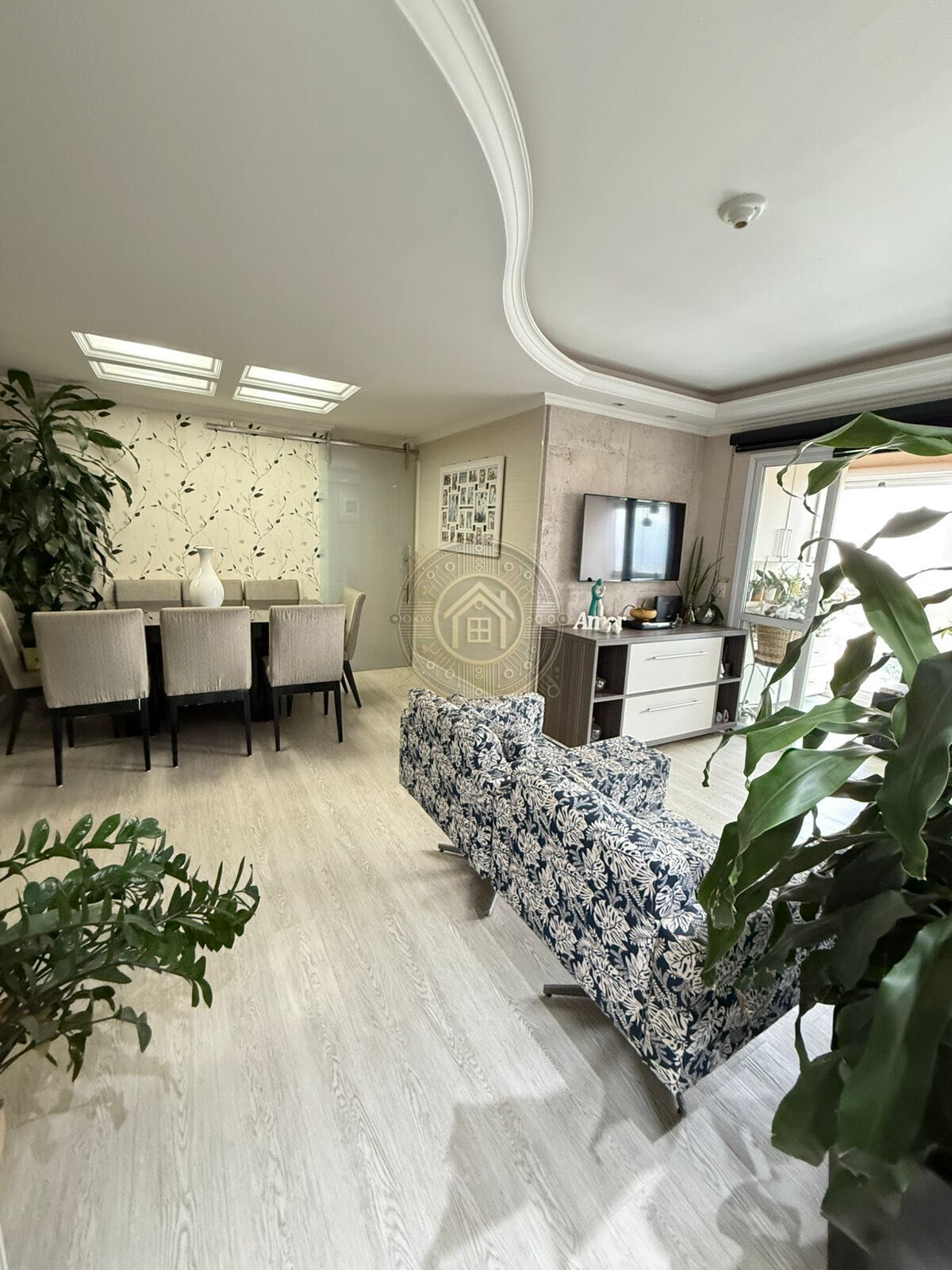 A sala ampla de estar e jantar se destaca pelo acabamento com sanca em gesso e iluminação diferenciada, criando um ambiente elegante e acolhedor. O imóvel dispõe ainda de terraço gourmet, com armários planejados, envidraçamento e cortinas blackout, ideal para momentos de lazer e convivência.