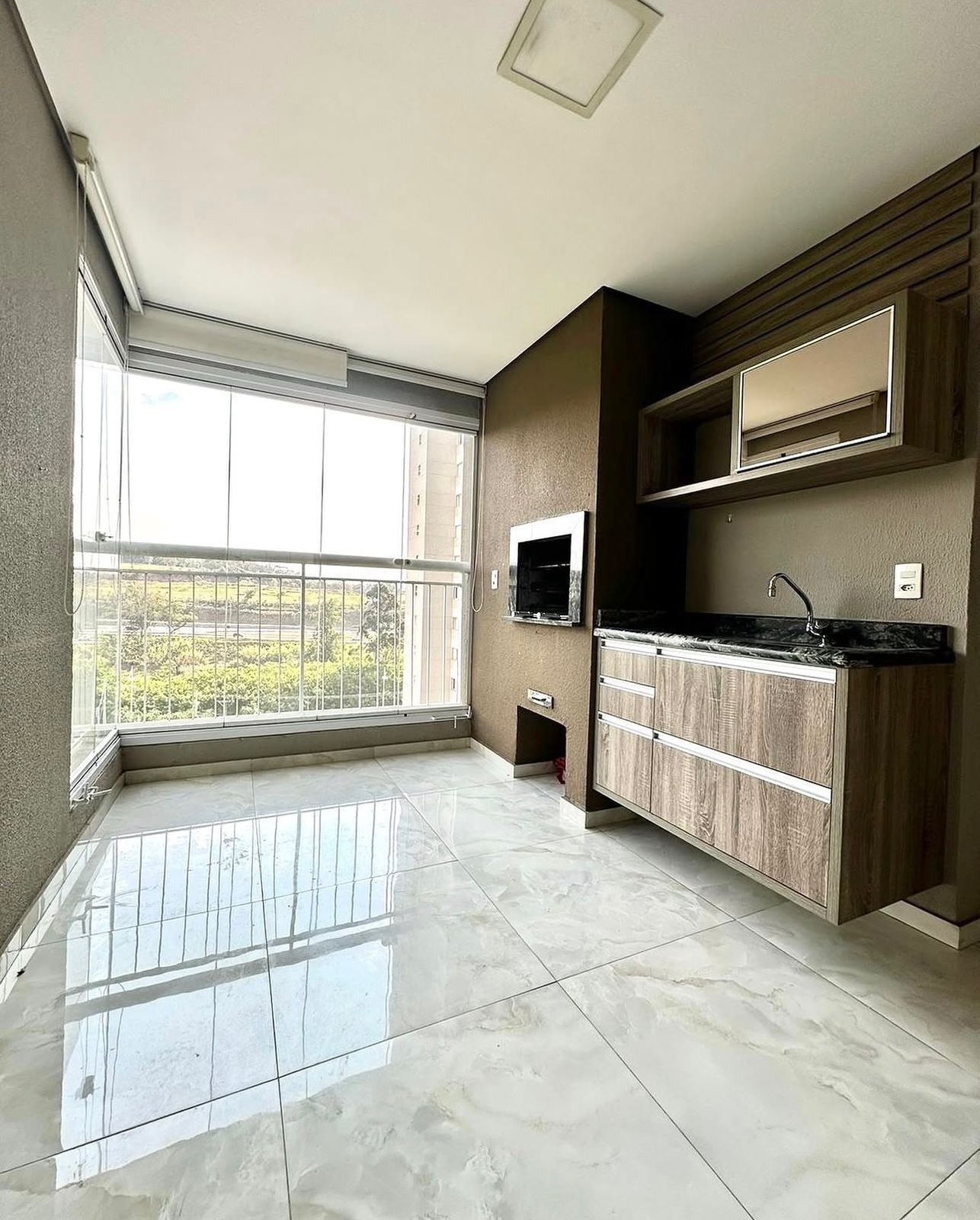 - Varanda gourmet com churrasqueira a carvão e fechamento em vidro
