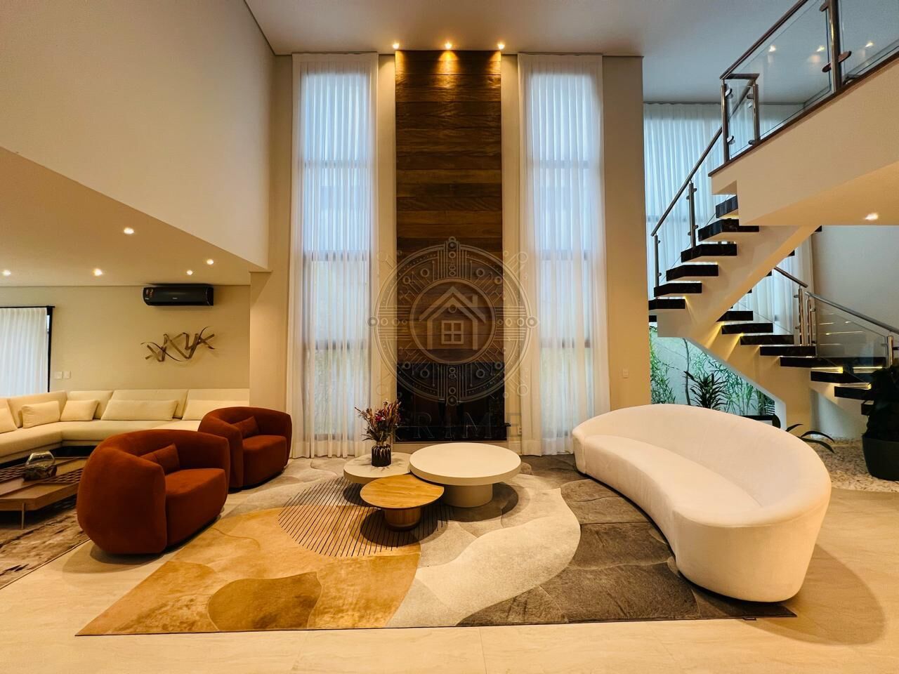 - Sala com pé-direito duplo, proporcionando imponência, iluminação natural abundante e sensação de amplitude.
